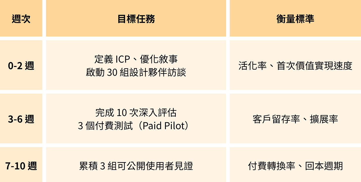 Norman 提出一套 90-Day Sprint 方法論,幫助團隊在三個月內完成從想法到市場驗證的飛行測試。關鍵指標如下: