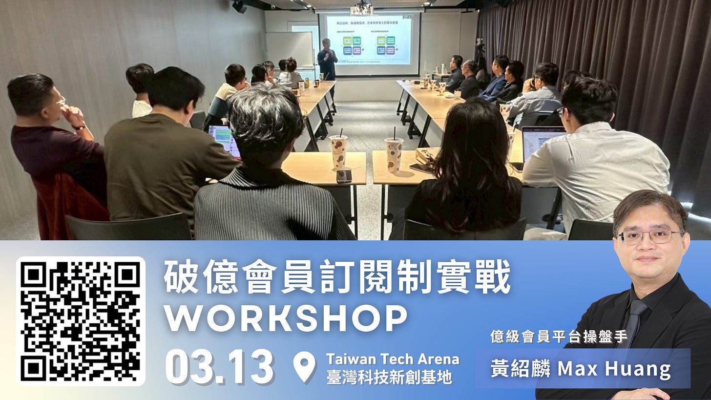3/13(五)破億會員訂閱制實戰 Workshop,Max 將把過去操盤億級用戶的變現經歷,濃縮成適合台灣新創與企業的營運框架。