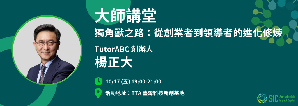 感謝您訂閱 SIC 永續影響力投資電子報!為了回饋您的支持,我們特別提供 3 個寶貴名額,邀請您參與 SIC 大師講堂,與頂尖投資人學習創業與投資心法!